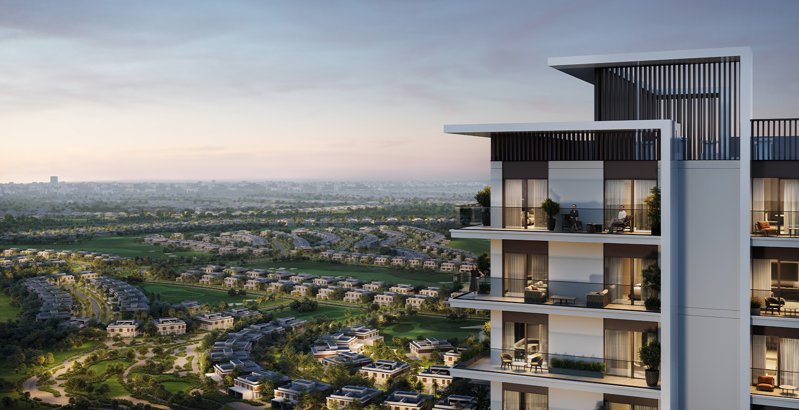 Light-filled homes bordered by parkland and fairways; balconies gaze across the greens and Dubai skyline.